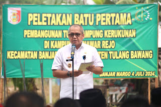Tulang Bawang,Merpatilampung.com- Pj Bupati Tulang Bawang Drs.Qudrotul Ikhwan.,MM yang dalam hal ini di wakili oleh Sekdakab. Tulang Bawang Ferli Yuledi, SP., MM., Mt. memberikan sambutan sekaligus menghadiri acara peletakan Batu Pertama Tugu Kerukunan di Lapangan Kampung Penawar Rejo, Banjar Margo, Kamis (4/7/24).